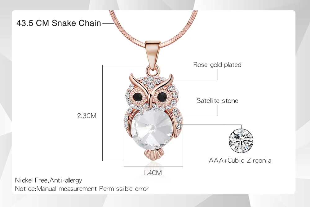 Rose Gold Color New Fashion Snake Chain Crystal Necklace Sweater Jewelry Fashion Small Cute Owl Bird Pendant For Women Gift